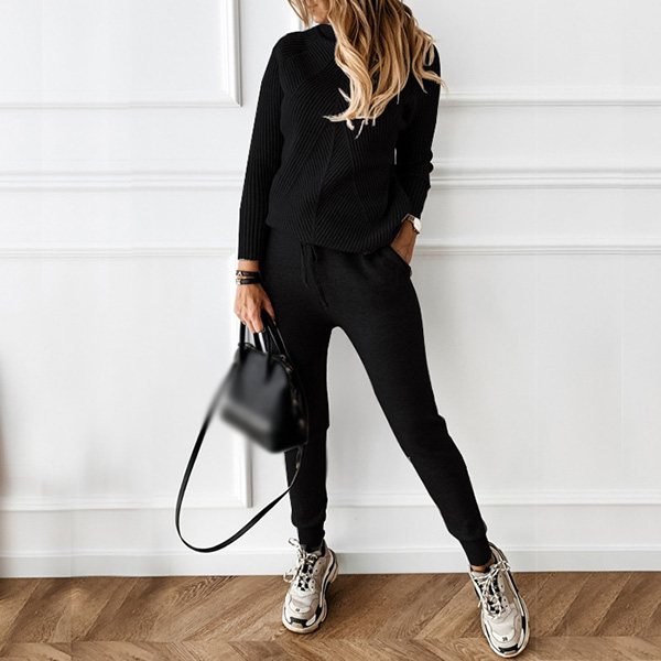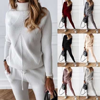 Fashion Solid Color Turtleneck Knit Sweater + Pants Two-piece Set