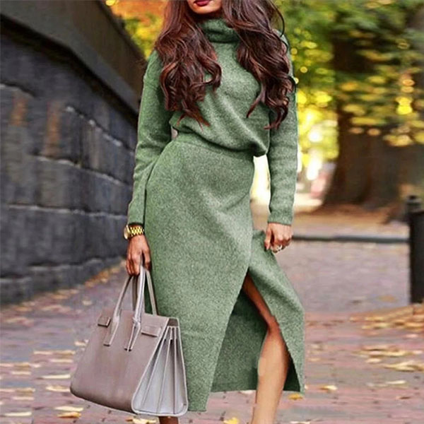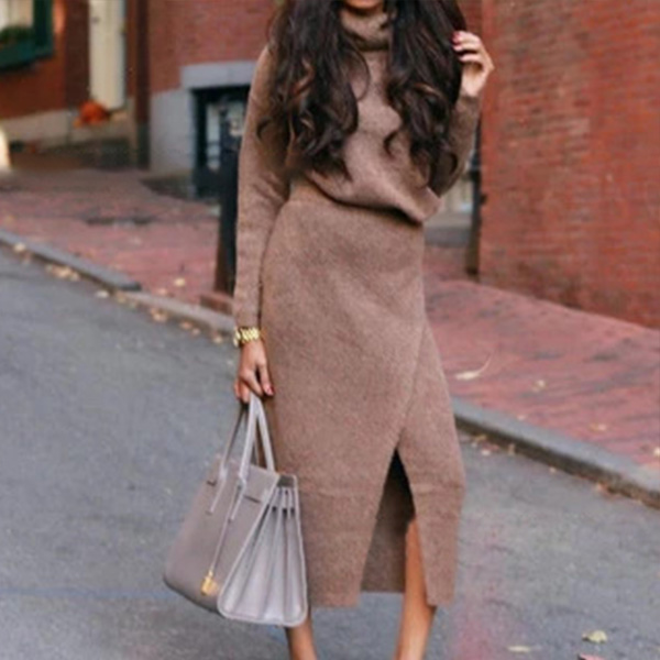 Fashion Solid Color Turtleneck Knit Top + Slit Skirt Length Skirt Two-piece Set
