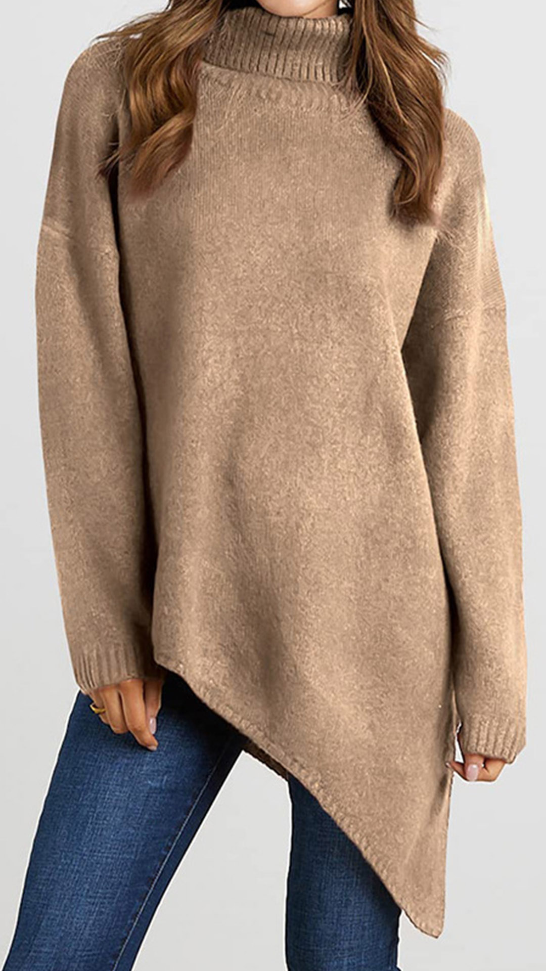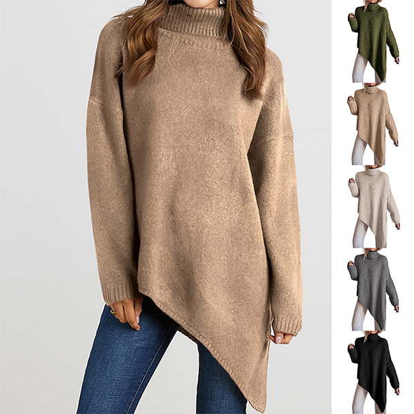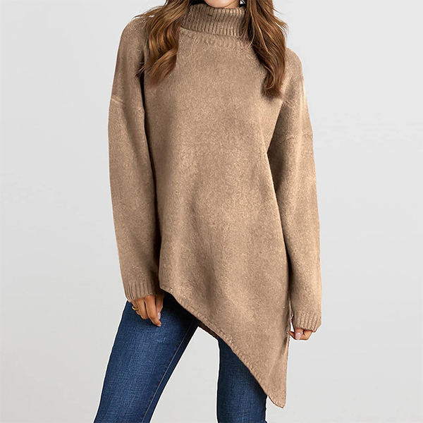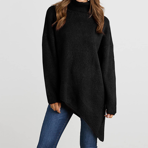 A stylish sweater! The turtleneck adds a classic and sophisticated touch, while the long sleeves provide coverage and warmth. The irregular hemline adds a unique and trendy element, elevating the overall look of the sweater. Whether you’re going for a casual day out or want to add a stylish layer to your outfit, this sweater is a versatile choice.