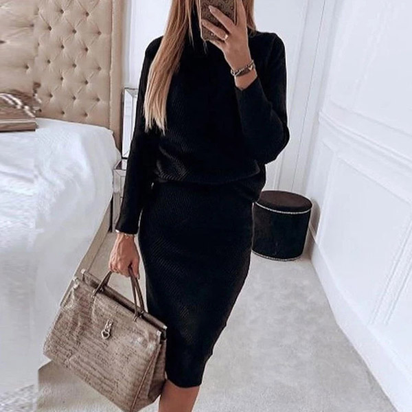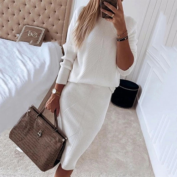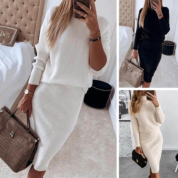 For these spring and autumn days,this knit two-piece set can easily strike your mind. Solid color style,including a long sleeve turtleneck knit top and a high waist skirt,this two-piece set can keep you warm while it maintains your style. It is also a good way to upgrade your style.