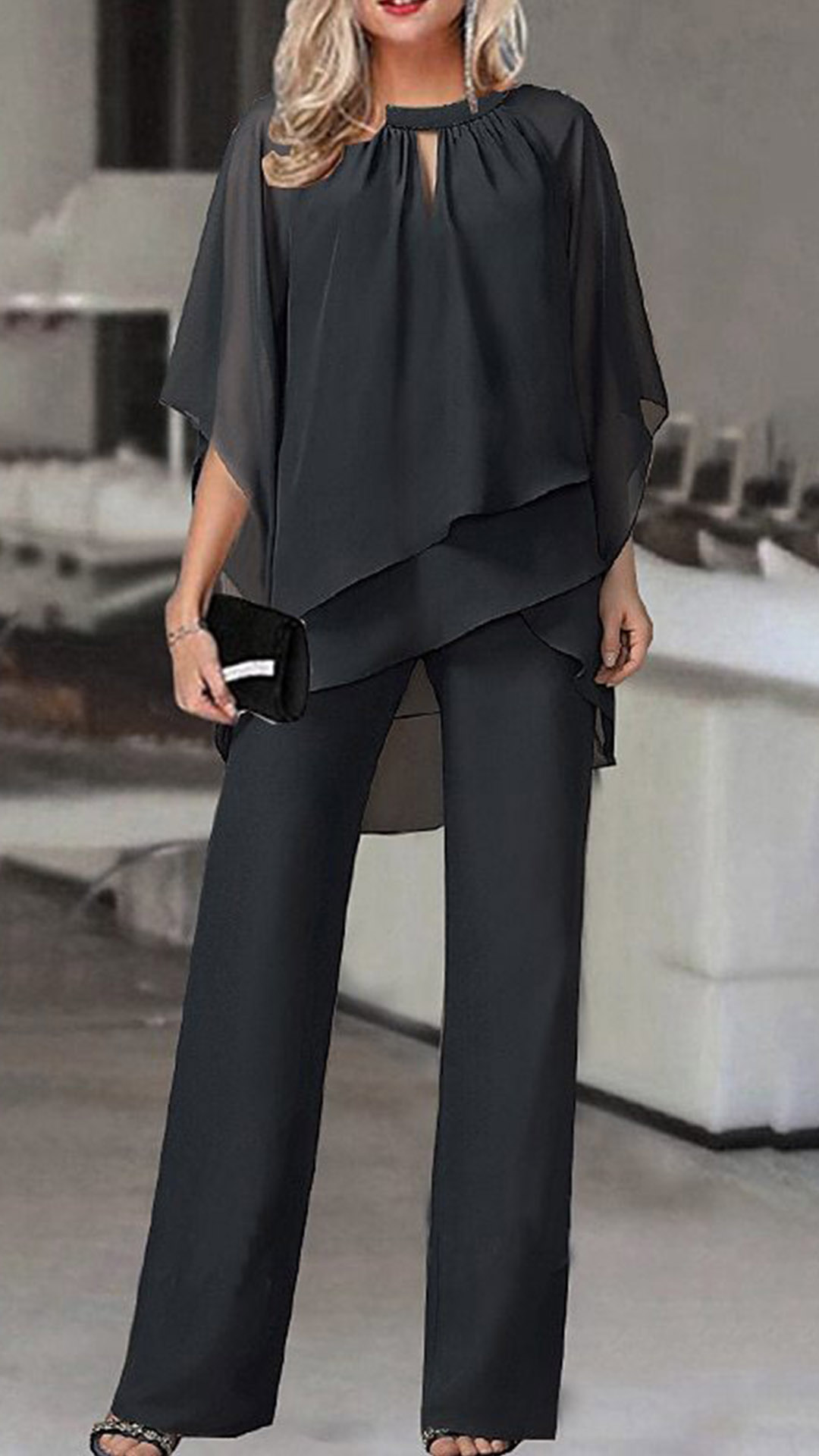 Elevate your fashion game with this trendy solid color two-piece set. The batwing sleeve shirt with irregular hemline adds a touch of effortless style, while the straight pants provide a sleek and polished look. This set is perfect for any occasion, whether it's a casual day out or some formal occasion!