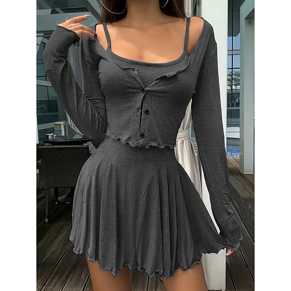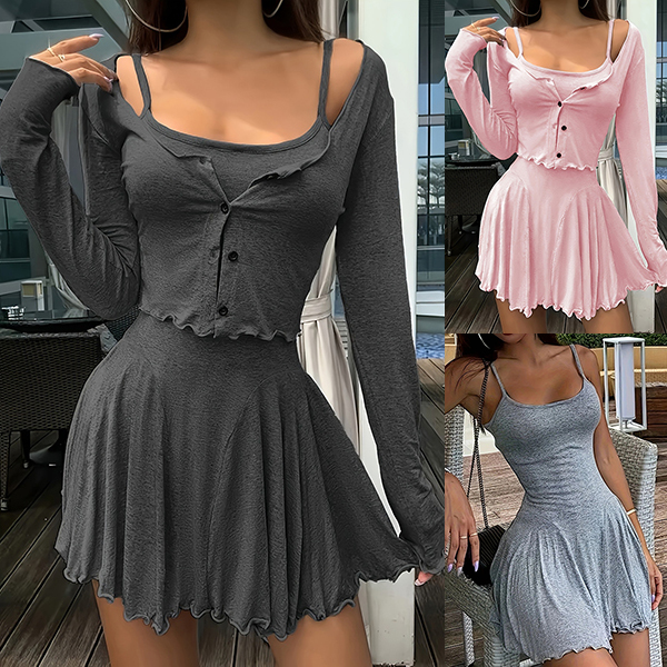 This charming coordinated set combines sophisticated layering with romantic feminine details. The crop cardigan provides stylish coverage with contemporary proportions. The cami ruffle dress brings delicate texture and graceful movement through its ruffle detailing. Wanna have a try?