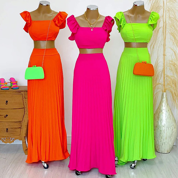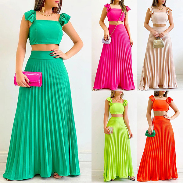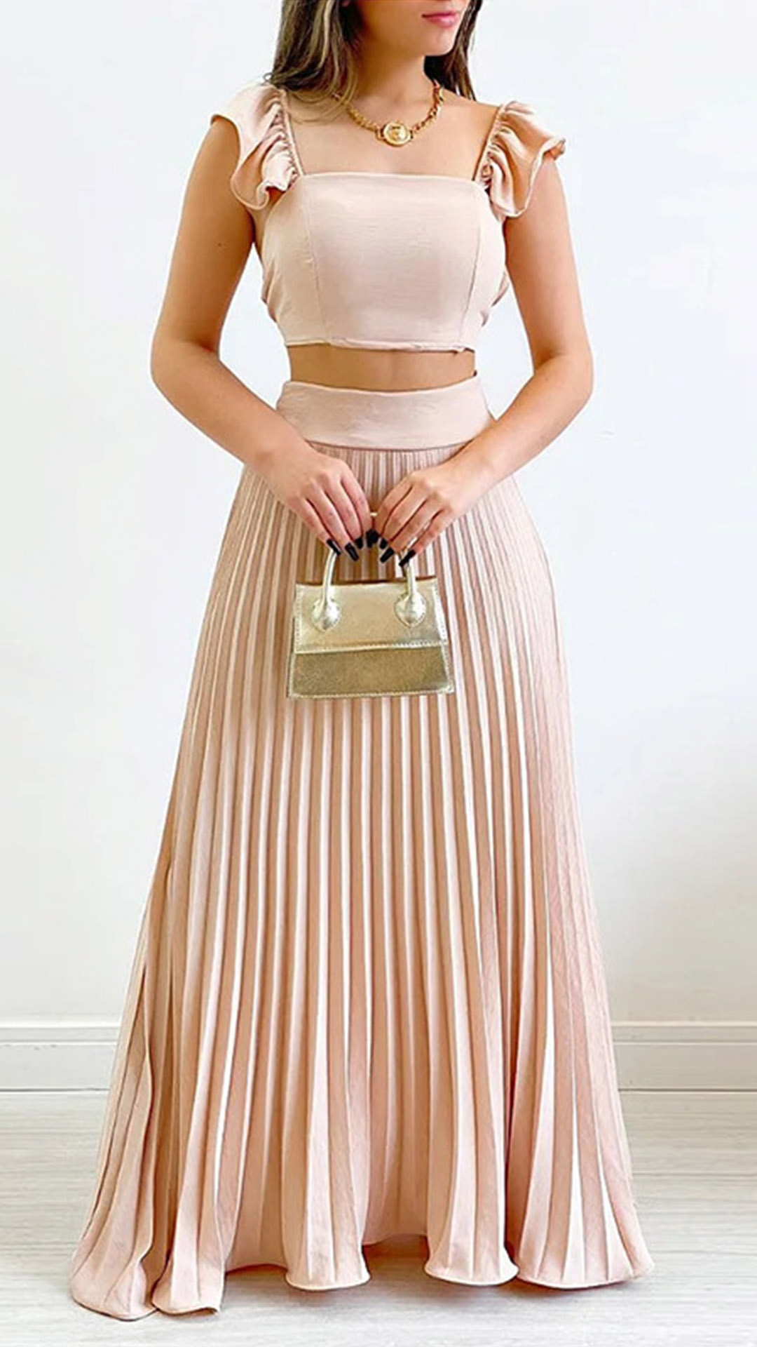 The two-piece set consists of a crop top and pleated maxi skirt, offering a trendy and stylish ensemble. The set can be worn together for a cohesive and fashion-forward outfit, or each piece can be styled separately for versatility. Hope you like it.
