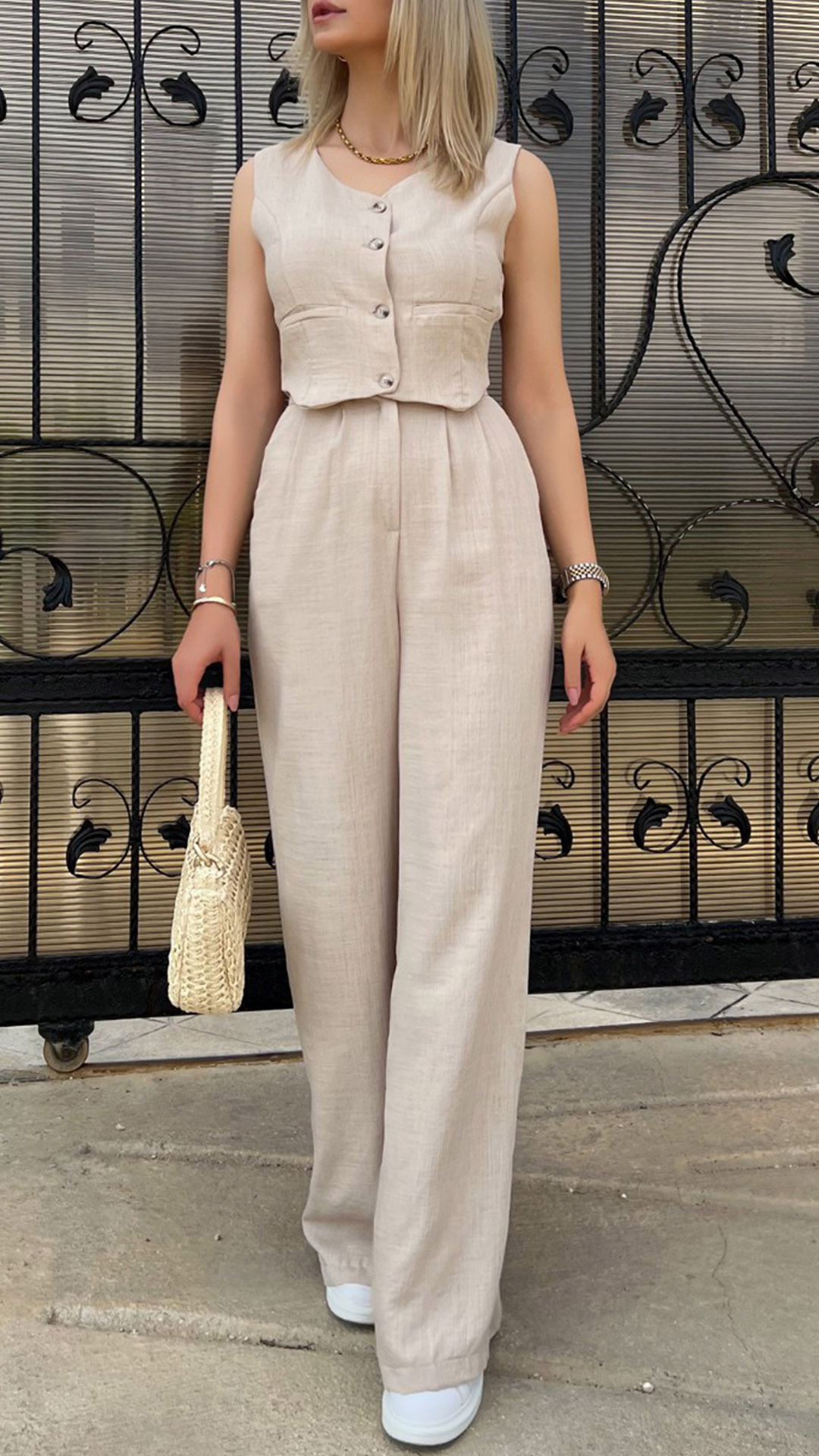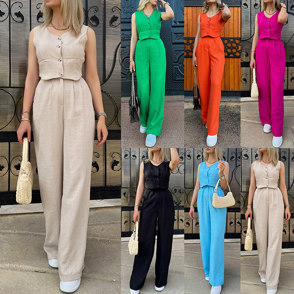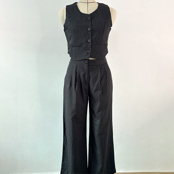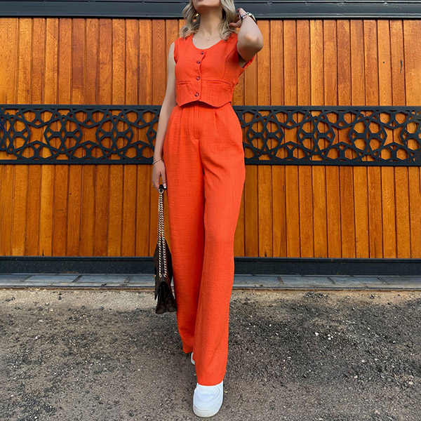 Crafted with high-quality materials, this set offers both style and comfort. It consisting of a crop top and straight-cut pants. This stylish and versatile set offers a sleek and coordinated look, perfect for various occasions.