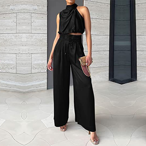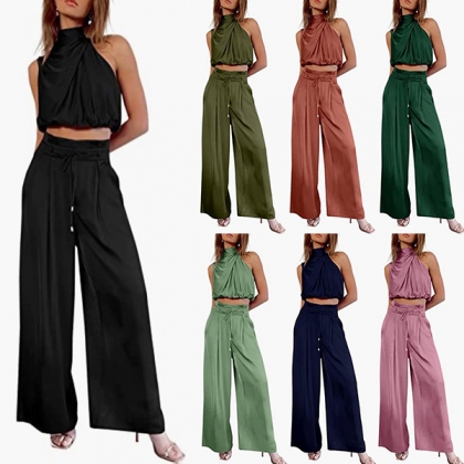 Fashion Solid Color Two-piece Set Consist of Crop Top and Straight-cut Pants