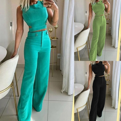Fashion Solid Color Two-piece Set Consist of Crop Top and Straight-cut Pants