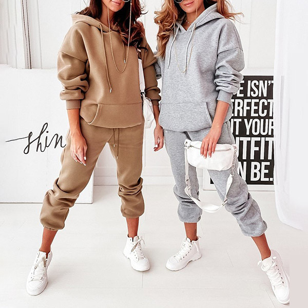 Fashion Solid Color Two-piece Set Consist of Drawstring Hooded Sweatshirt and Drawstring Sweatpants