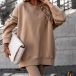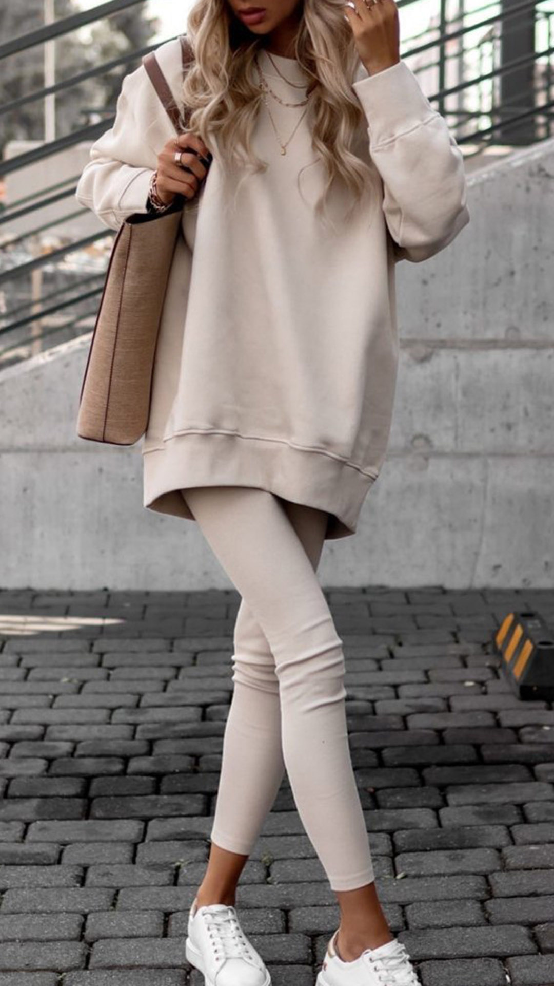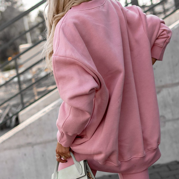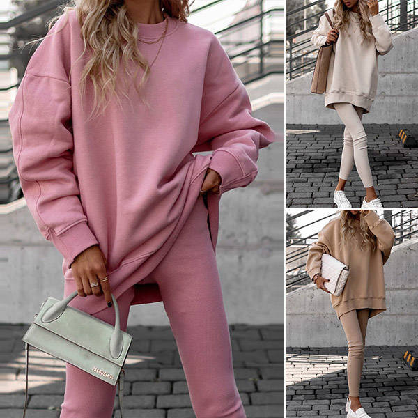 This set offers a trendy and coordinated look that combines comfort and fashion effortlessly. The loose sweatshirt provides a relaxed and laid-back vibe, perfect for casual outings or lounging. The solid color design adds versatility and allows for easy pairing with other wardrobe pieces. Paired with the set are skinny pants, creating a balanced and flattering ensemble.