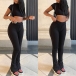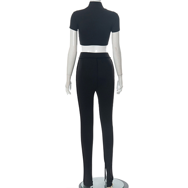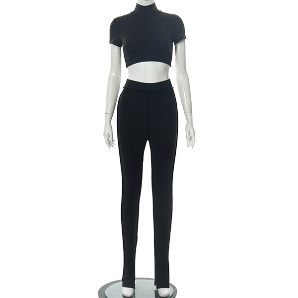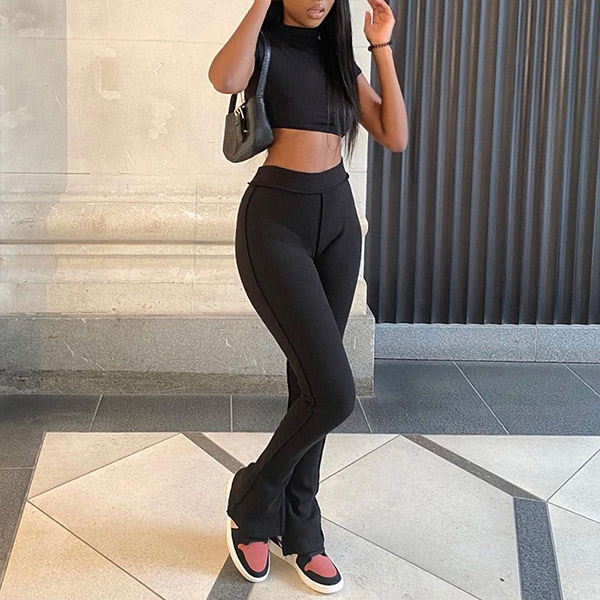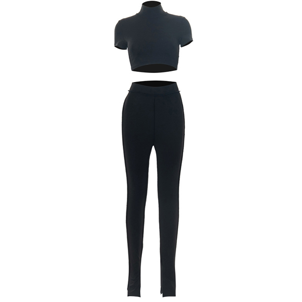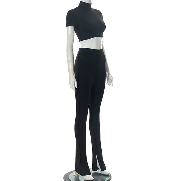 Fashion Solid Color Two-piece Set consist of Mock Neck Crop Top and Wide-leg Pants