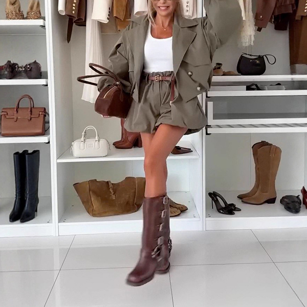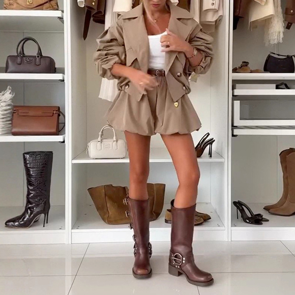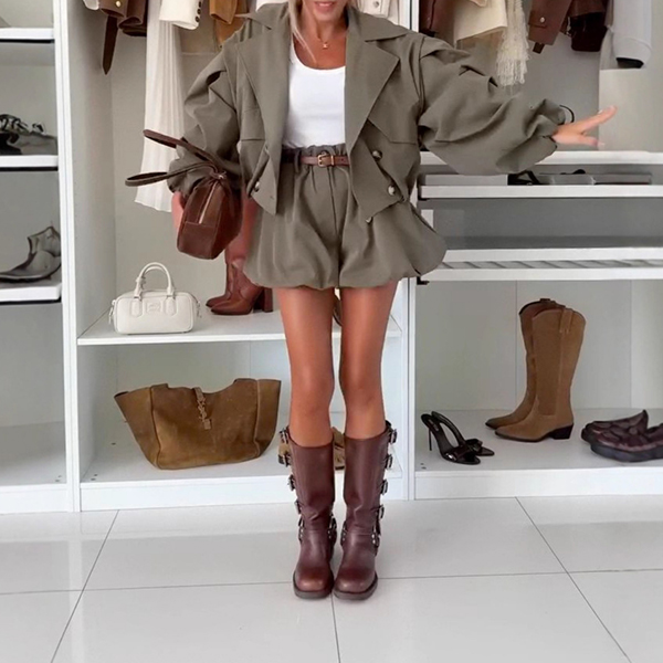 This two-piece set combines tailored notch lapel jacket with feminine ruffle shorts in coordinated solid color. The notch lapel jacket with double-breasted design brings professional elegance with classic tailoring details whilst the ruffle shorts add romantic movement and youthful charm. Wanna have a try?