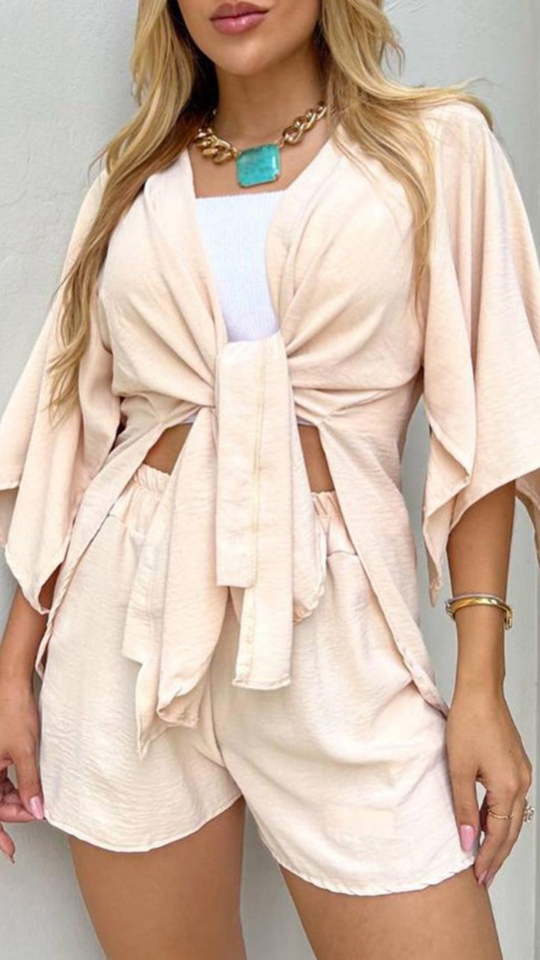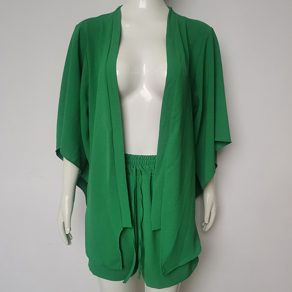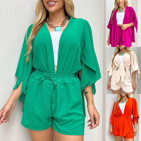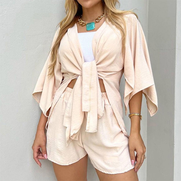 The set features a solid color design, providing a versatile and timeless aesthetic. The self-tie cardigan can be worn open or closed, allowing for different styling options. The drawstring shorts feature an adjustable waistband, providing a comfortable and customizable fit. They are designed with a relaxed and casual silhouette, perfect for lounging or casual outings.