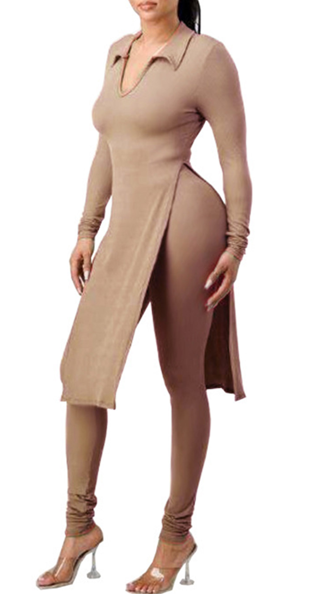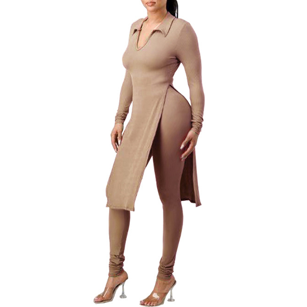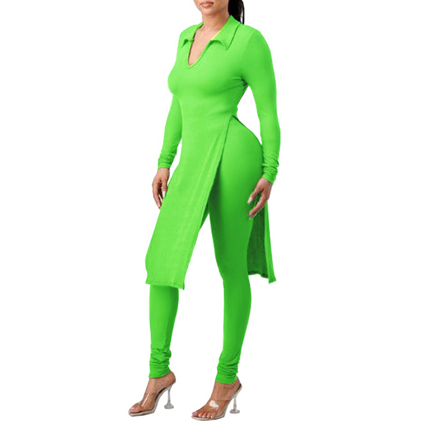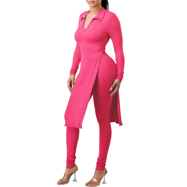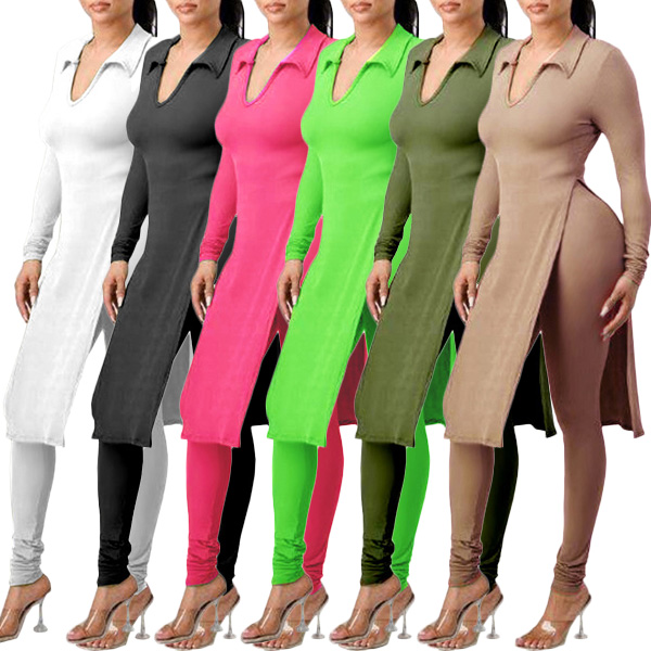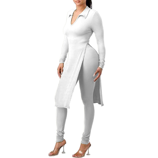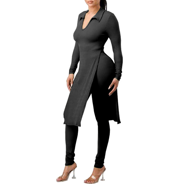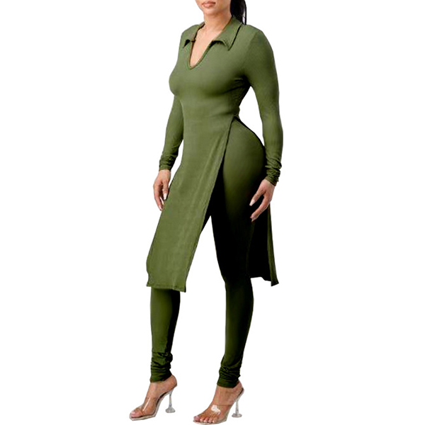 This is a stylish two-piece set consisting of a slit shirt and high-rise skinny pants, both made of a solid color fabric. The shirt features a stand color, V-neck and flattering slit design, while the pants are tailored for a perfect fit that accentuates the figure. This set is perfect for any occasion where you want to look both trendy and comfortable, and it can be worn together or separately to create a variety of stylish looks.