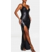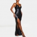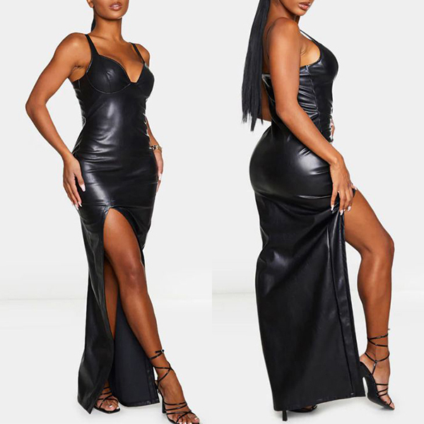 This is a stunning and bold dress that combines a solid color design, V-neckline, backless detail, side slit, artificial leather PU material, and a maxi dress silhouette for a glamorous and edgy look. Perfect for party wear~