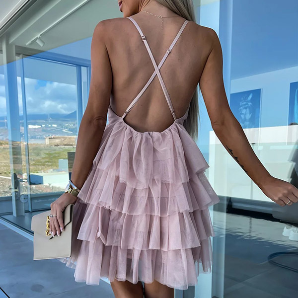 Fashion Solid Color V-neck Backless Tiered Party Dress