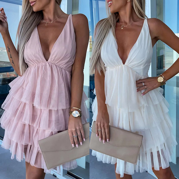 This stunning dress features a flattering V-neckline and a unique tiered design that adds a touch of elegance and sophistication. The backless style is both daring and alluring, while the solid color creates a sleek and stylish look that's perfect for any event. White and pink, which one do you like?