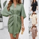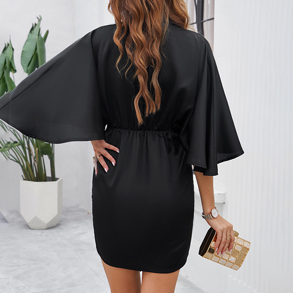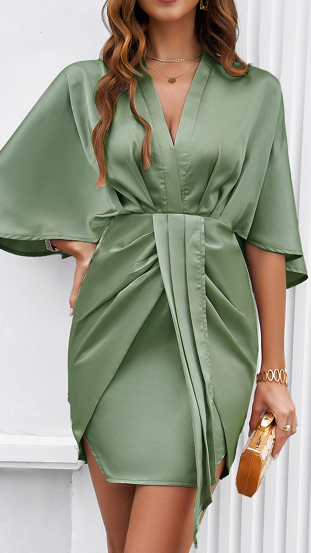 Fashion Solid Color V-neck Batwing Short Sleeve Ruched Bodycon Dress