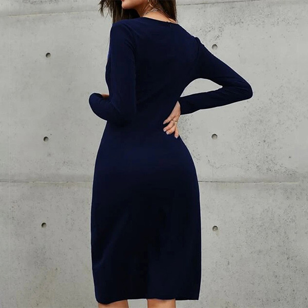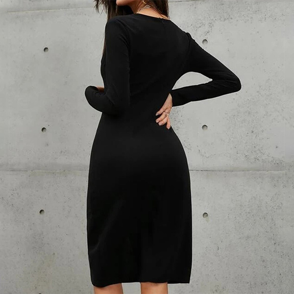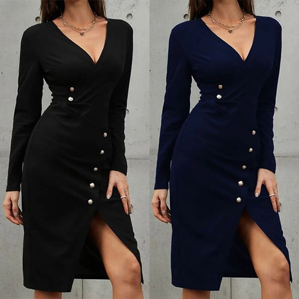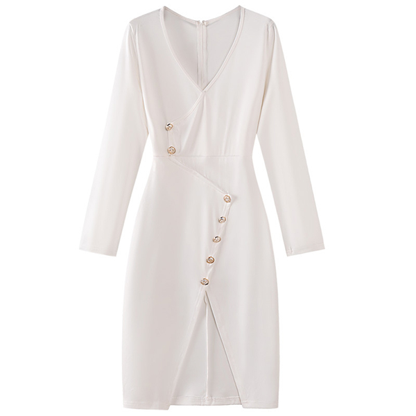 This fashionable and figure-flattering dress is perfect for daily wear! It features a solid color, V-neckline, buttoned details, and a slit bodycon silhouette. Dress it up with heels and a statement necklace for a chic look.