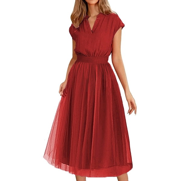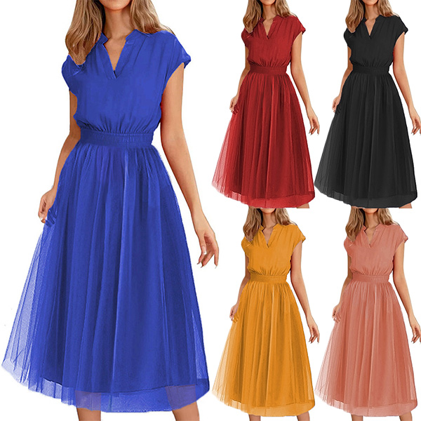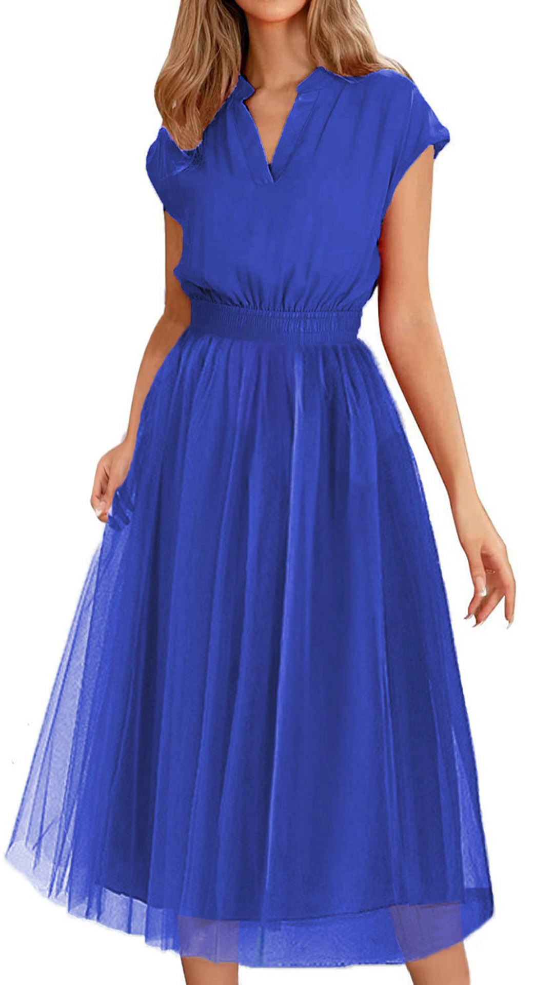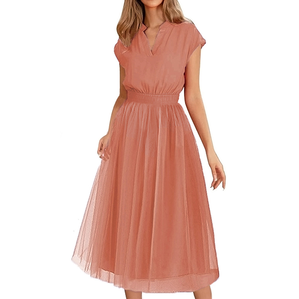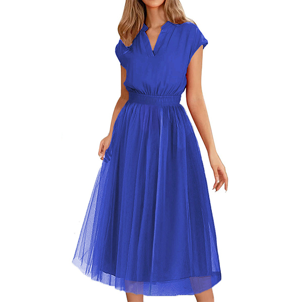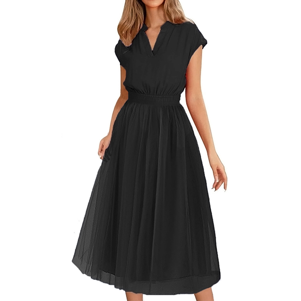 This dress combines a classic silhouette with modern details, creating a chic and stylish look that is perfect for any occasion. The V-neckline adds a touch of femininity and elegance, while the cap sleeves provide a flattering and comfortable fit. The gauze splicing skirt adds a unique and fashionable element to the dress, creating a sense of texture and visual interest.