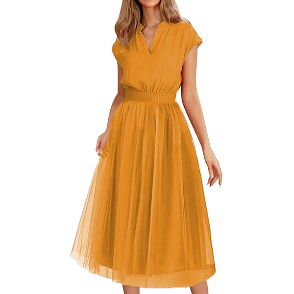 Fashion Solid Color V-neck Cap Sleeve Gauze Splcied Dress