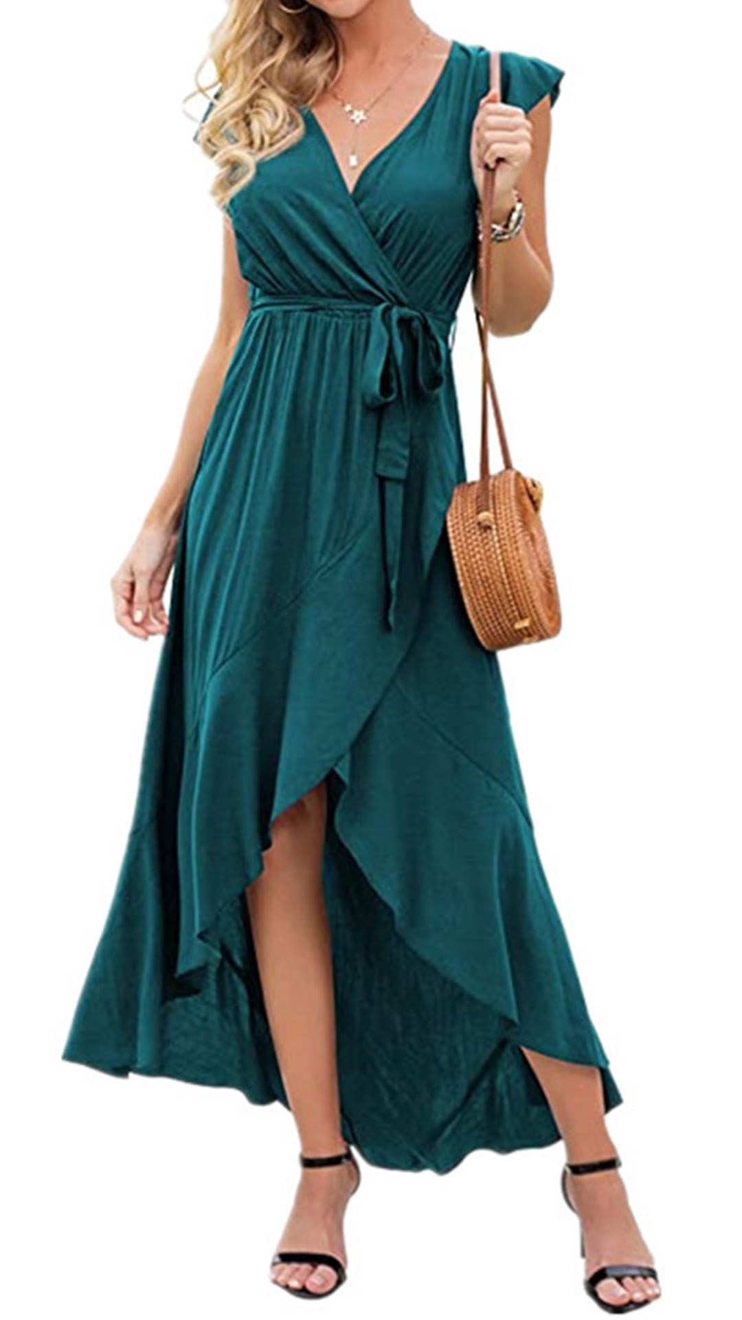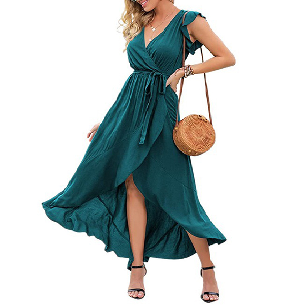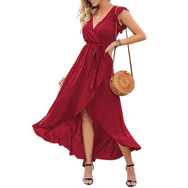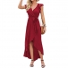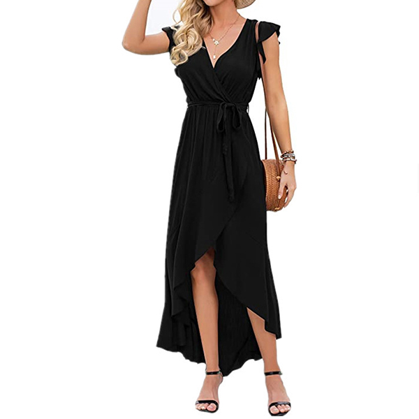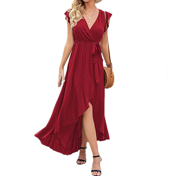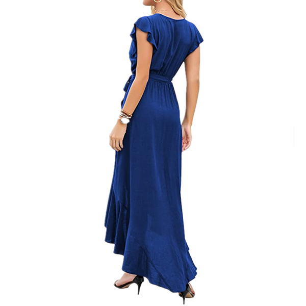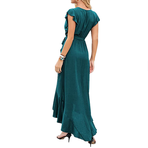 Fashion Solid Color V-neck Cap Sleeve Self-tie Irregular Ruffle Slit Hemline Dress