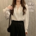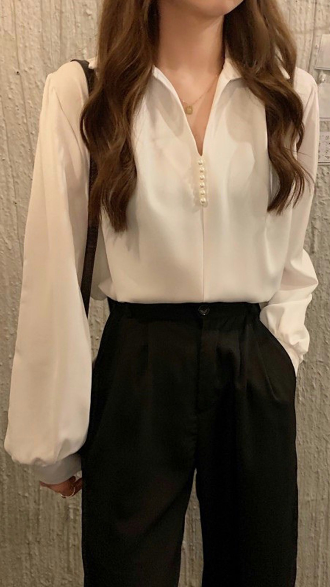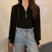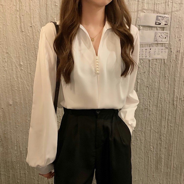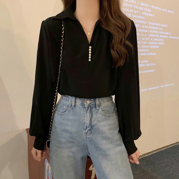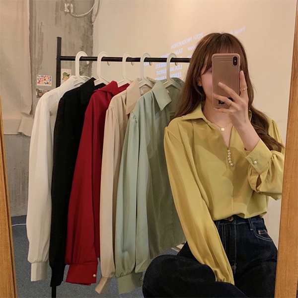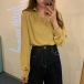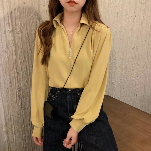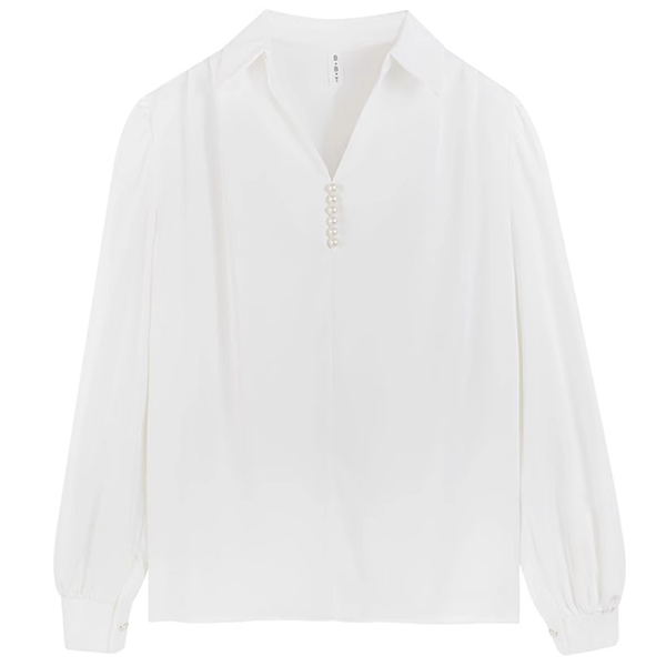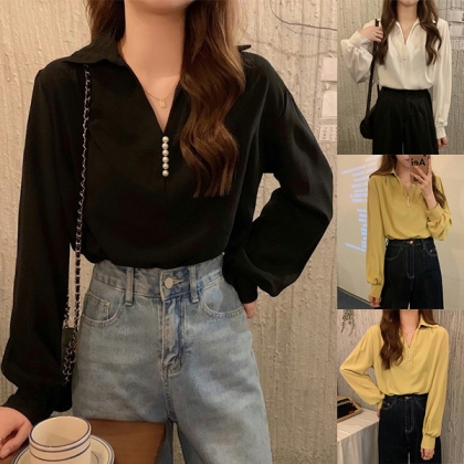 Fashion Solid Color V-neck Front Bead Long Sleeve Shirt