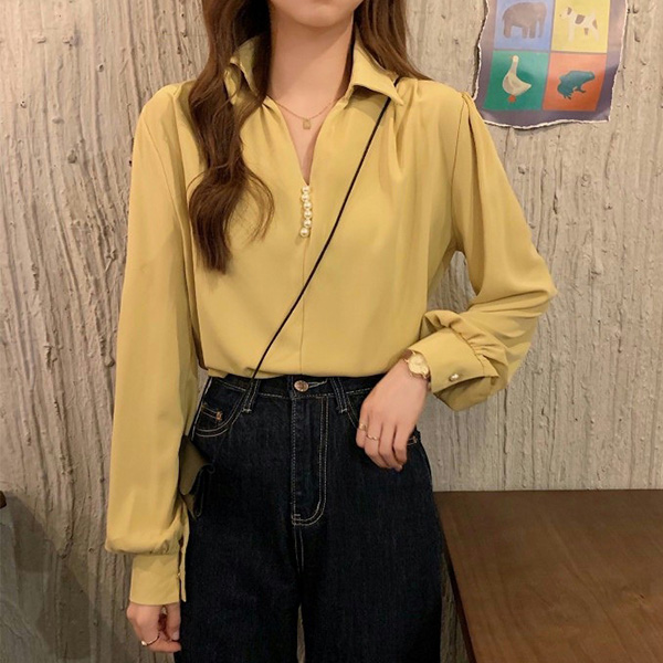 Elevate your wardrobe with this fashionable shirt. The V-neckline adds a touch of elegance and femininity, while the front bead detailing creates a chic and stylish look. The solid color design offers a classic and timeless aesthetic that can be easily paired with different bottoms and accessories. Multi-colors avabile.