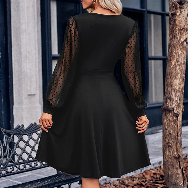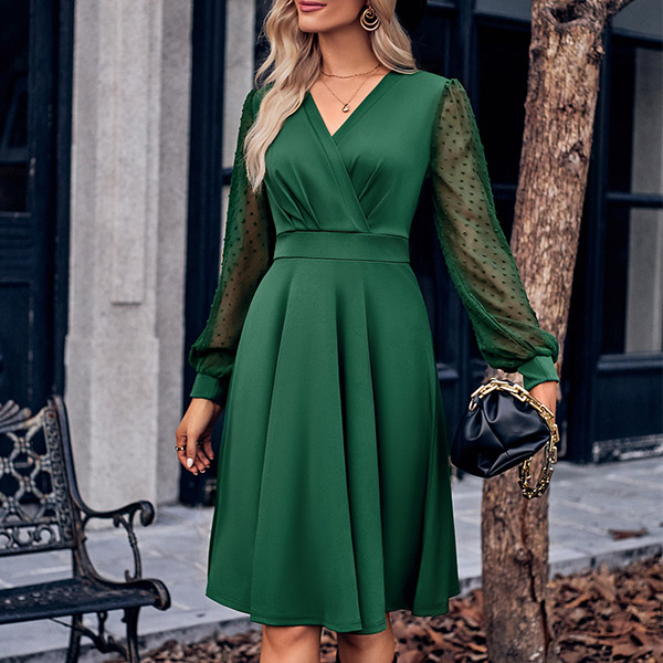 Fashion Solid Color V-neck Gauze Spliced Long Sleeve Dress