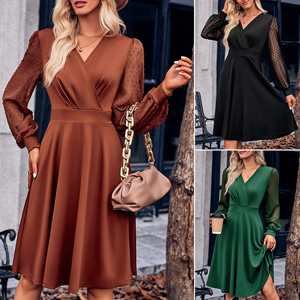 How about this dress? This dress features a solid color design, allowing versatility in styling options. The V-neckline offers a flattering and feminine touch, while the gauze splicing adds a unique and fashionable detail. Wanna have a try?