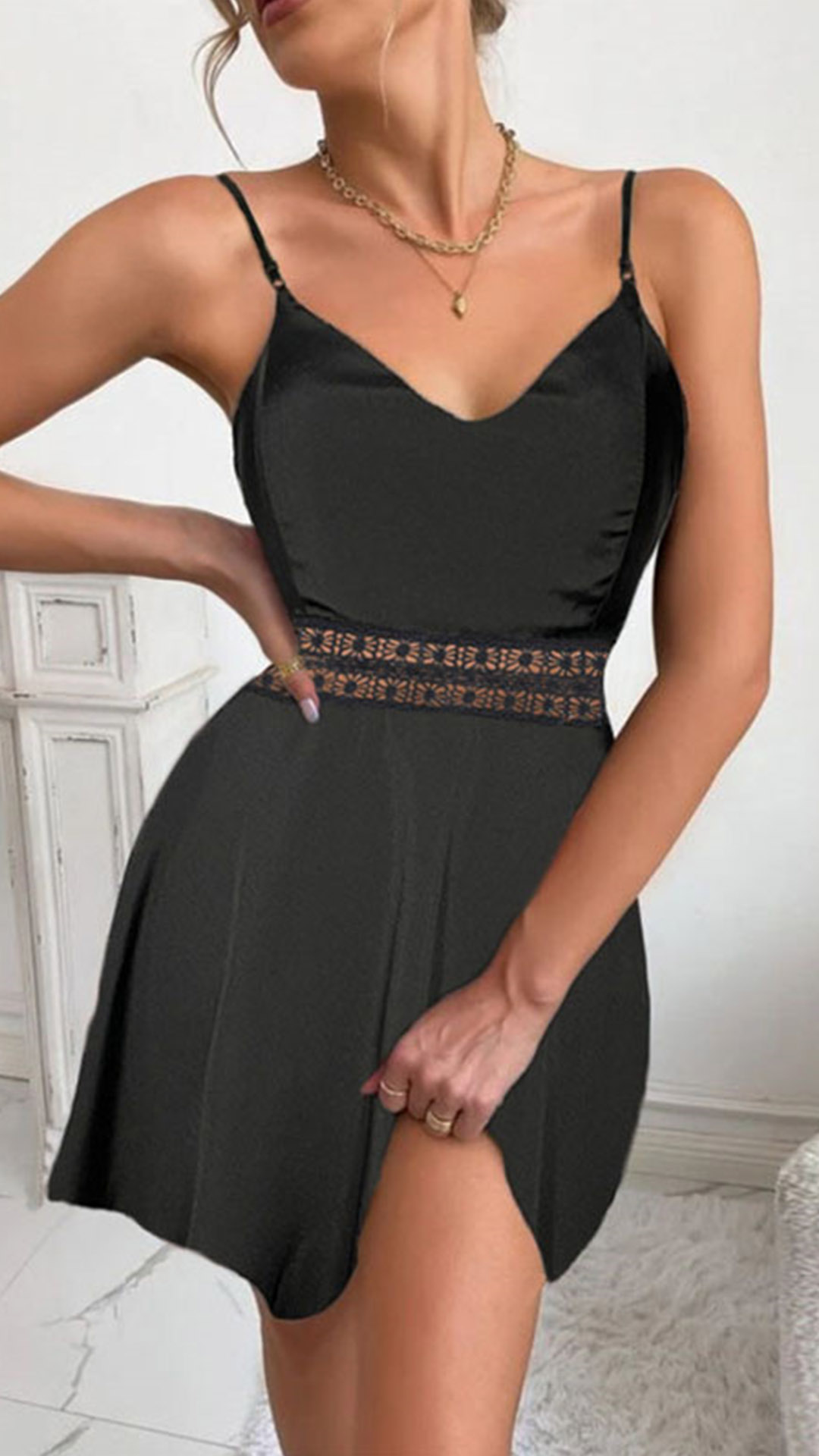 A solid color dress featuring a V-neckline, lace spliced along the waistline, narrow shoulder strap and a concealed back zipper.
