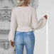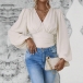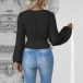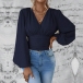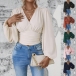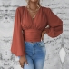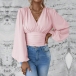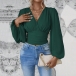 Fashion Solid Color V-neck Lantern Long Sleeve Ruched Shirt