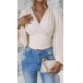 Look at this shirt! The V-neckline offers a flattering and elegant look, while the lantern sleeves add a touch of drama and sophistication. The ruched detailing adds texture and visual interest to the shirt, creating a stylish and trendy silhouette. Pair it with jeans for a more casual and relaxed look.