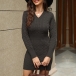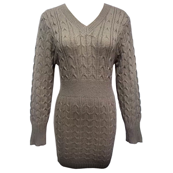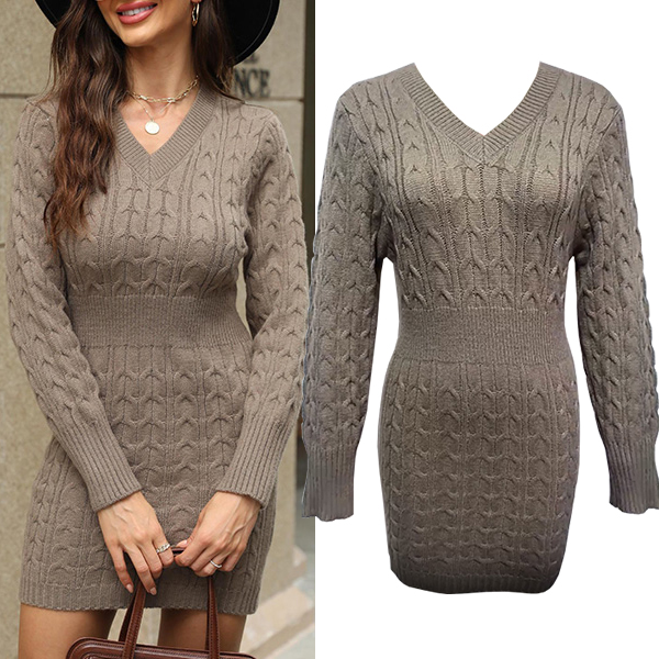 Fashion Solid Color V-neck Long Sleeve Cable Sweater Dress