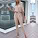 Fashion Solid Color V-neck Long Sleeve Cinch Waist Jumpsuit
