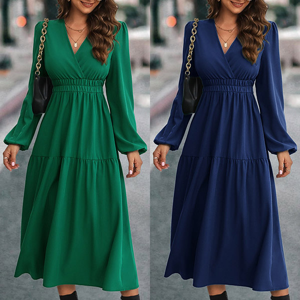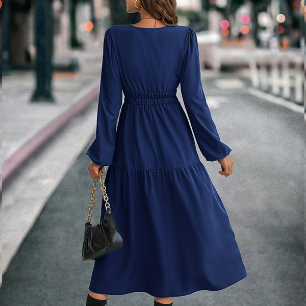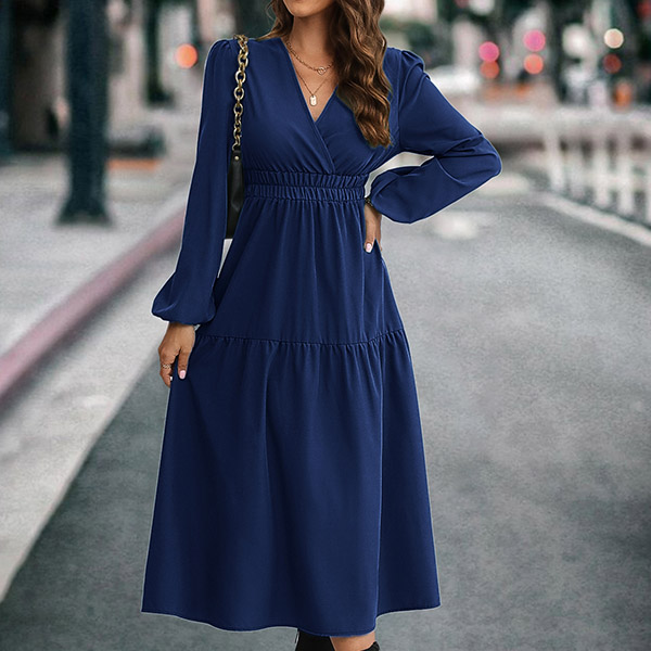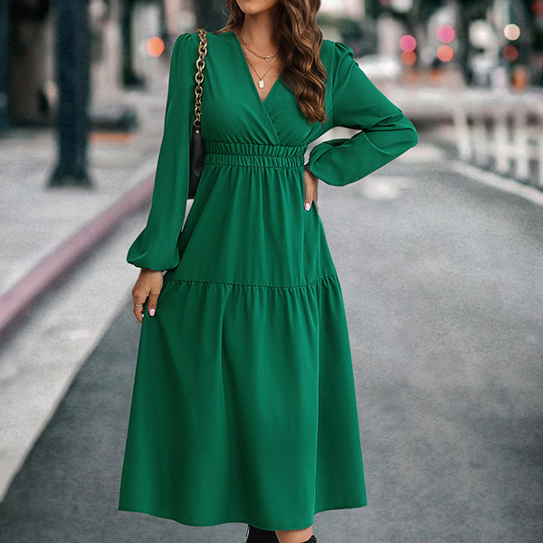 Fashion Solid Color V-neck Long Sleeve Cinch Waist Midi Dress