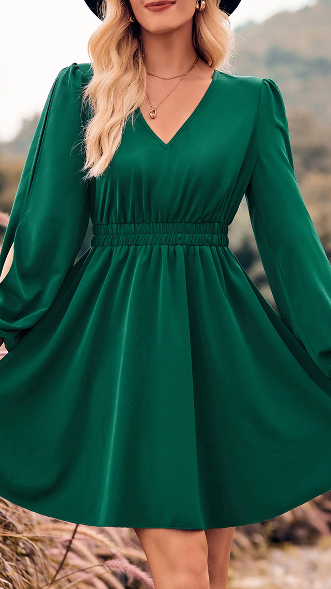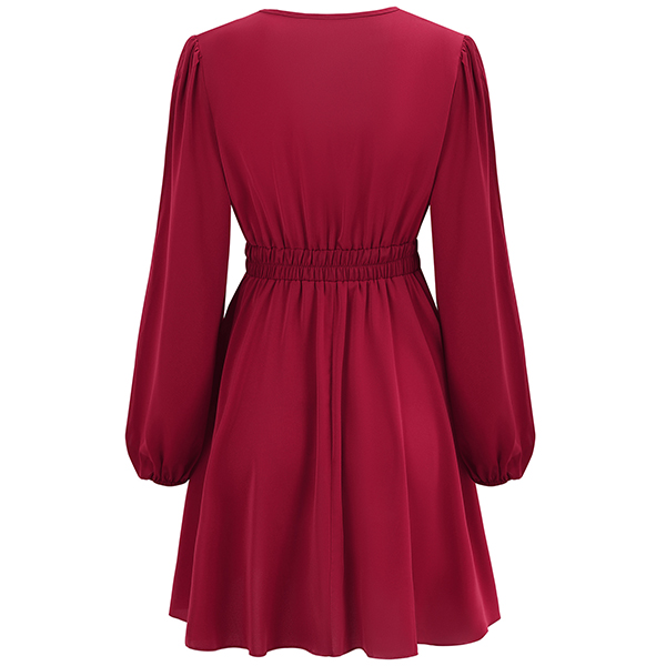 Fashion Solid Color V-neck Long Sleeve Cinch Waist Mini Dresss