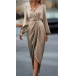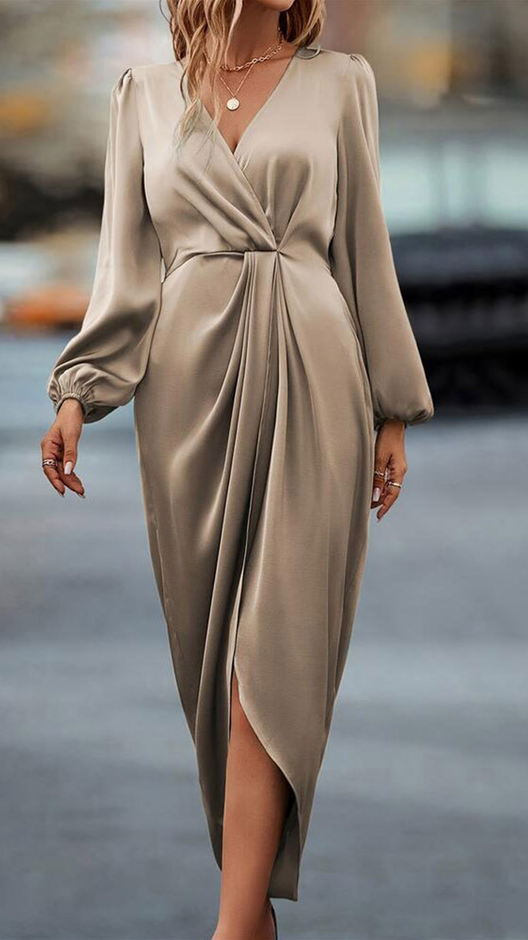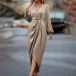 Fashion Solid Color V-neck Long Sleeve Front Slit Dress