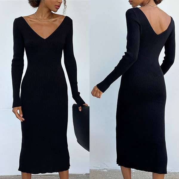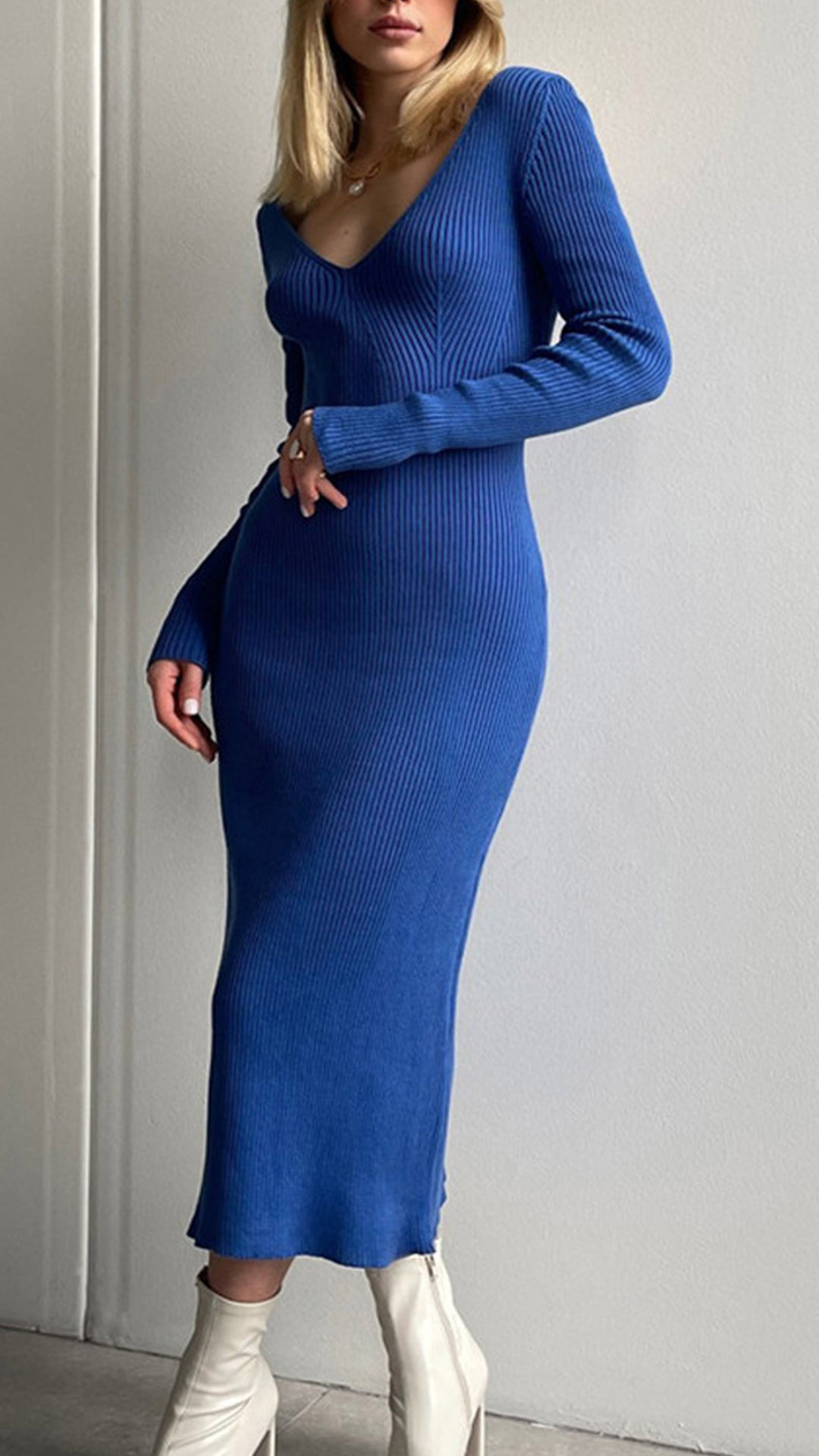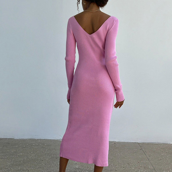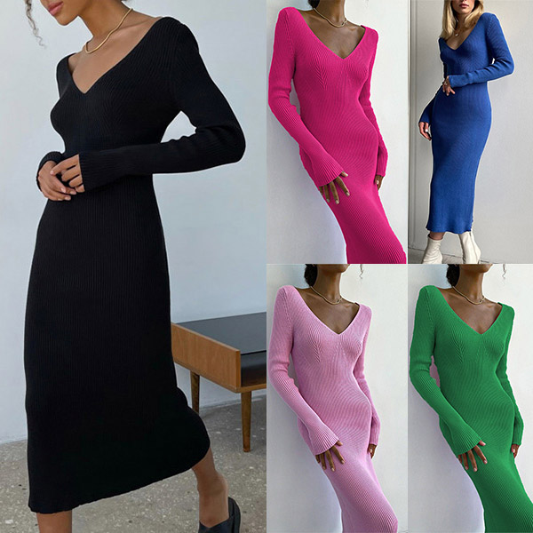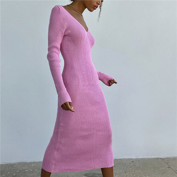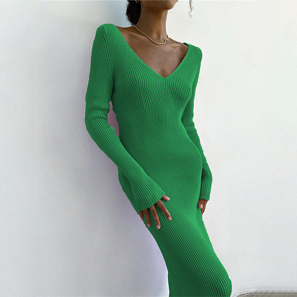 Fashion Solid Color V-neck Long Sleeve Knitted Bodycon Dress