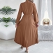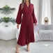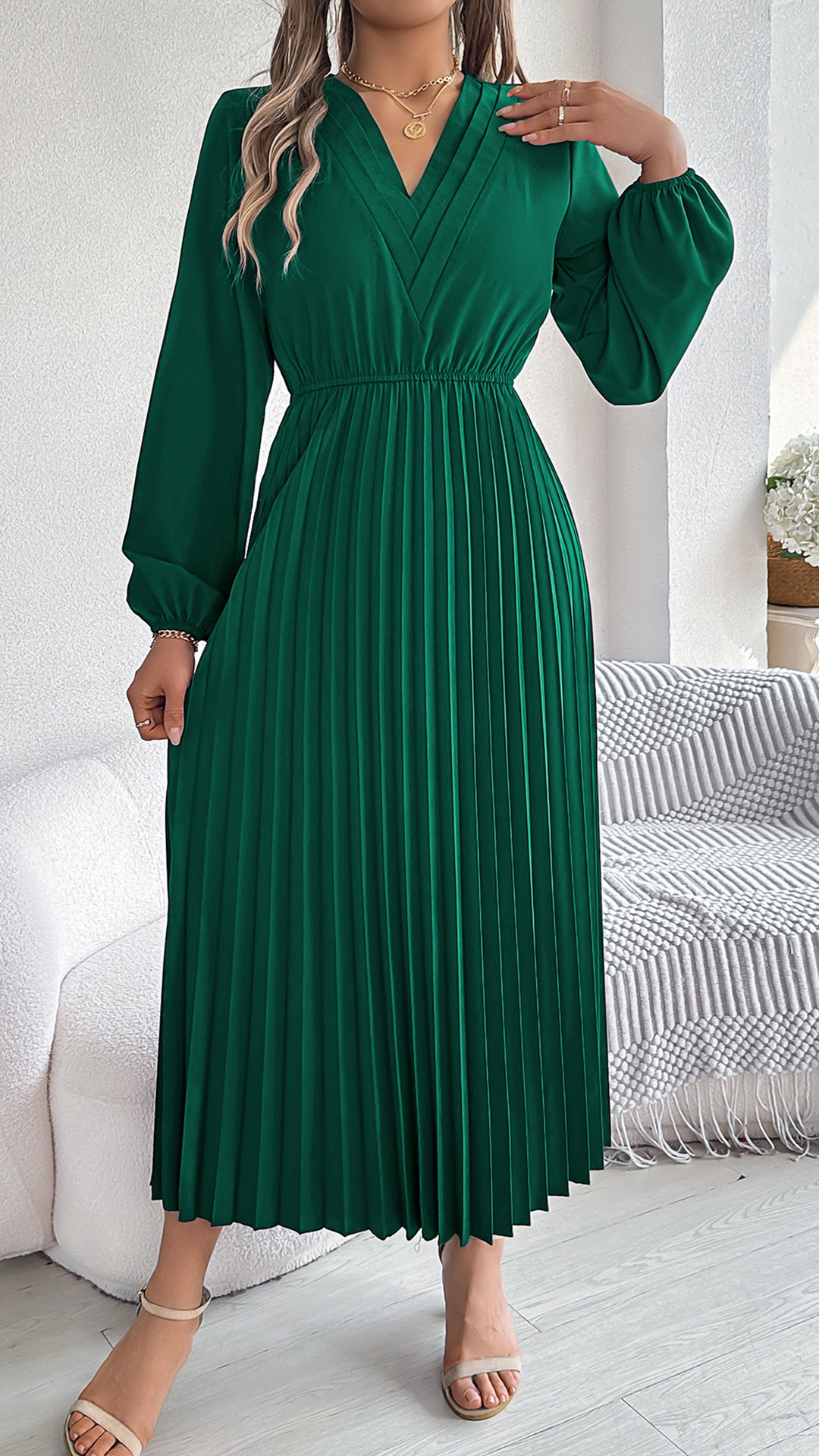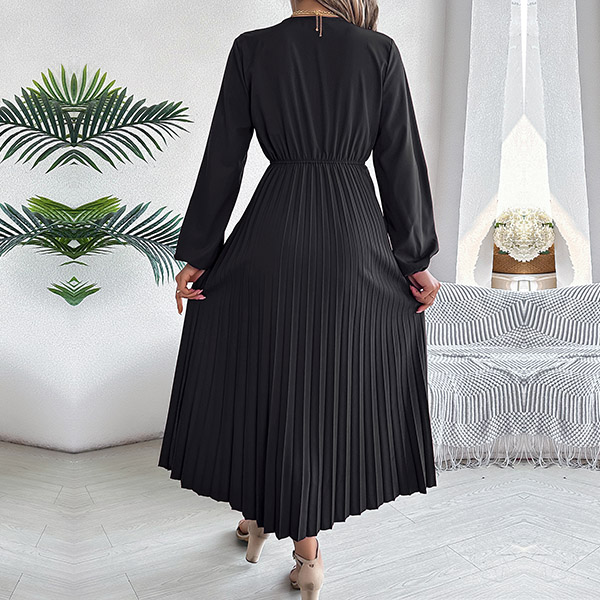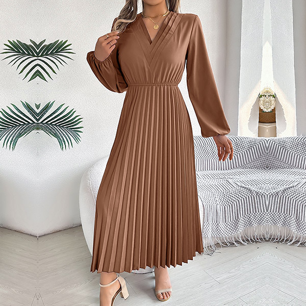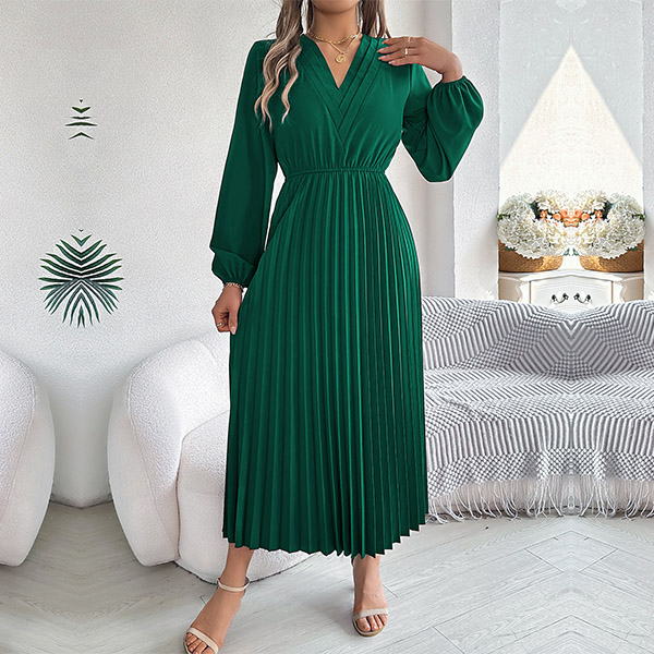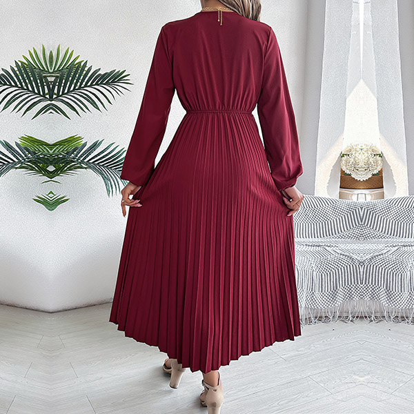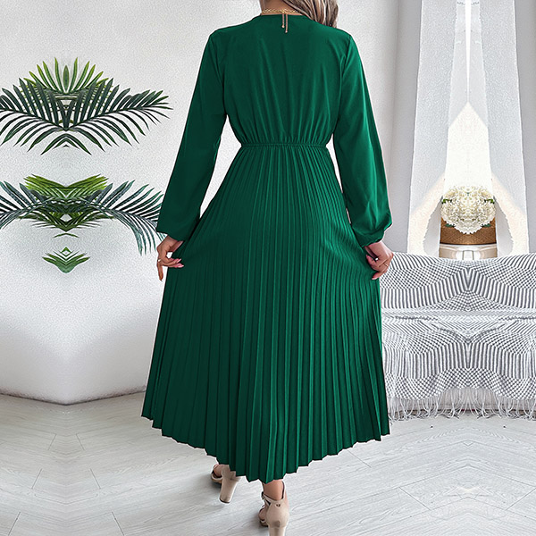Fashion Solid Color V-neck Long Sleeve Pleated Dress
