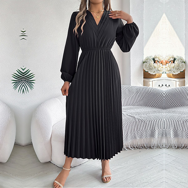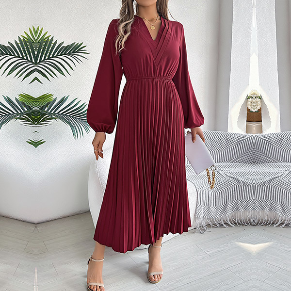 Look at this dress! It features solid color, V-neck, long sleeve and pleated skirt. Its timeless silhouette and sophisticated aesthetic make it an ideal choice for the modern, fashion-forward individual.