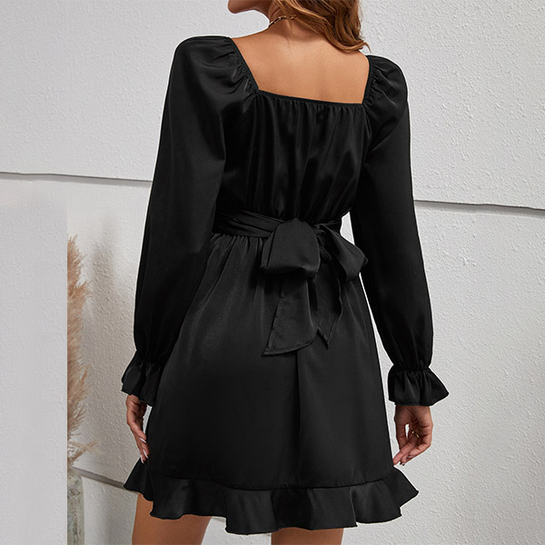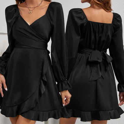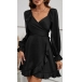 Fashion Solid Color V-neck Long Sleeve Ruffled Hemline Self-tie Mini Dress