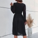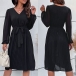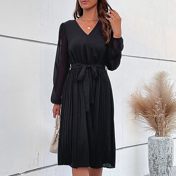 Fashion Solid Color V-neck Long Sleeve Self-tie Pleated Dress