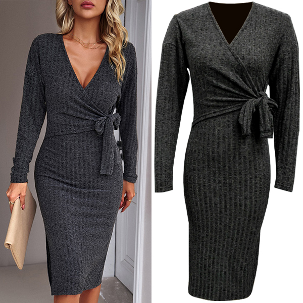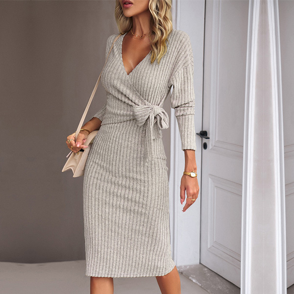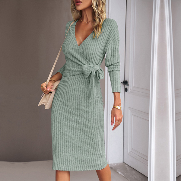 Fashion Solid Color V-neck Long Sleeve Self-tie Wrap Dress