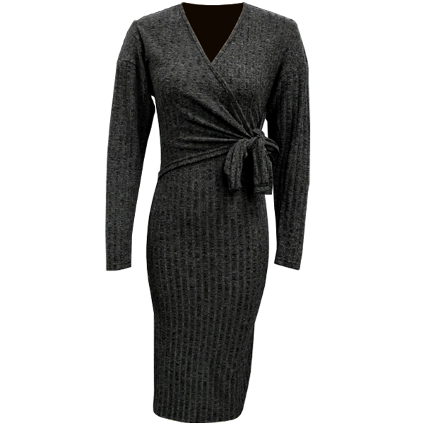 How about this dress? This dress features a classic V-neckline that adds a touch of femininity and elegance to the overall design. The self-tie wrap detail cinches the waist, creating a flattering silhouette and allowing for an adjustable fit. Perfect for day-to-day wear.