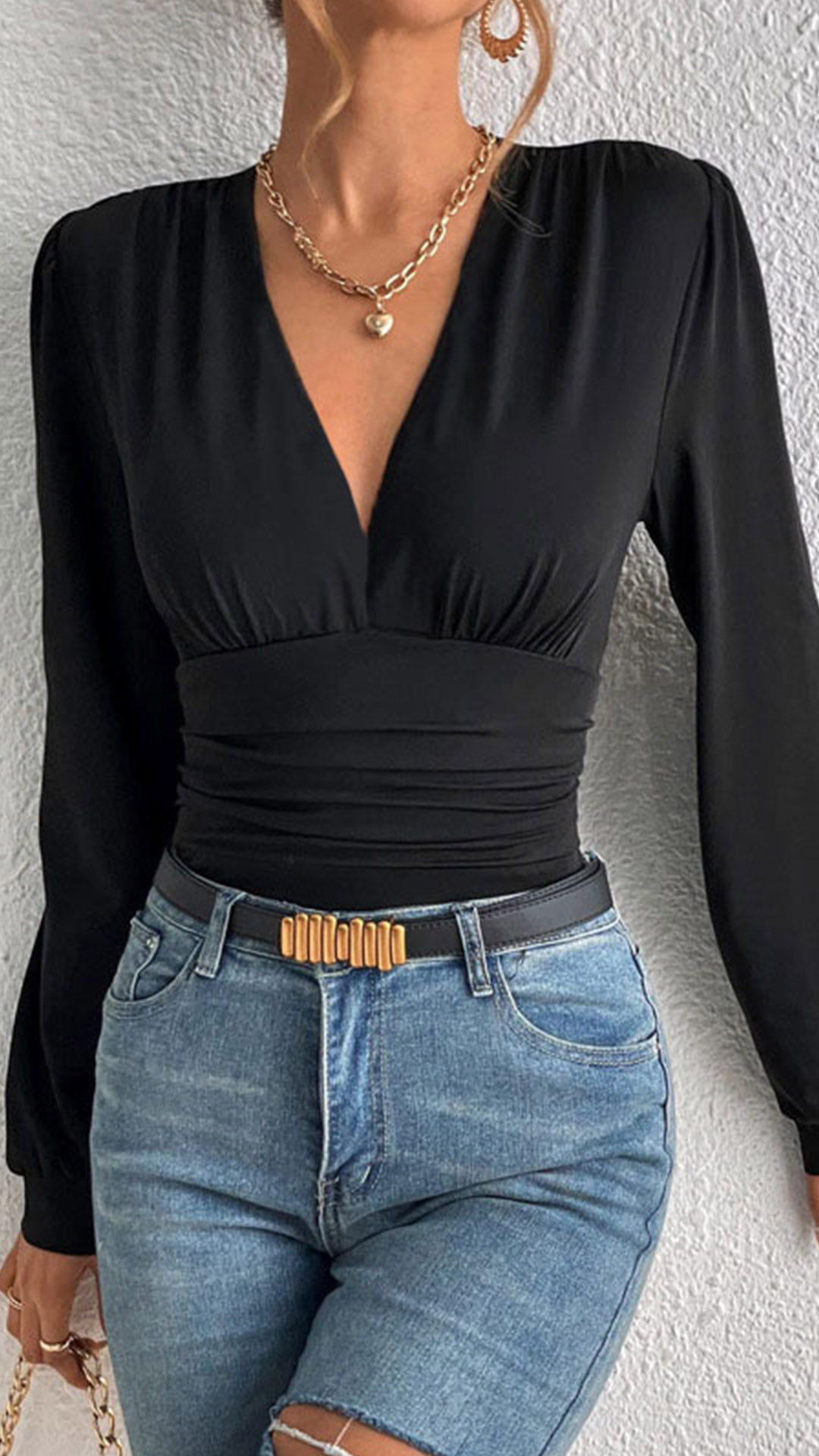 Elevate your wardrobe with this fashion-forward shirt. The V-neck design adds a touch of sophistication and femininity to the shirt, making it a versatile and stylish piece for any occasion. Pair this shirt with jeans for a casual and chic look!