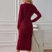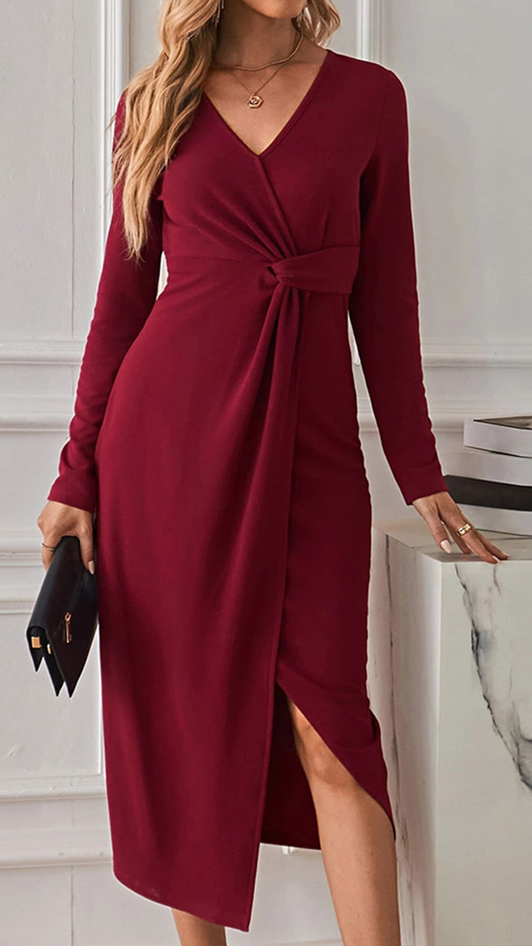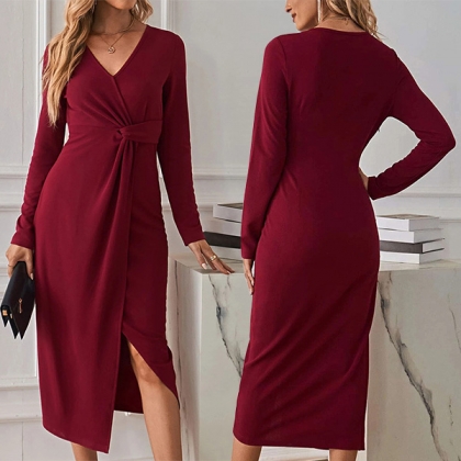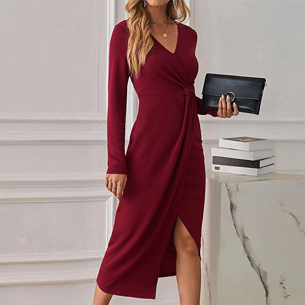 How about this dress? The solid color is versatile and can be dressed up or down, while the V-neck and long sleeves make it both sexy and elegant. The slit up the side adds a touch of spice, and the fitted silhouette is sure to flatter your figure.