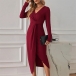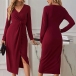 Fashion Solid Color V-neck Long Sleeve Slit Dress