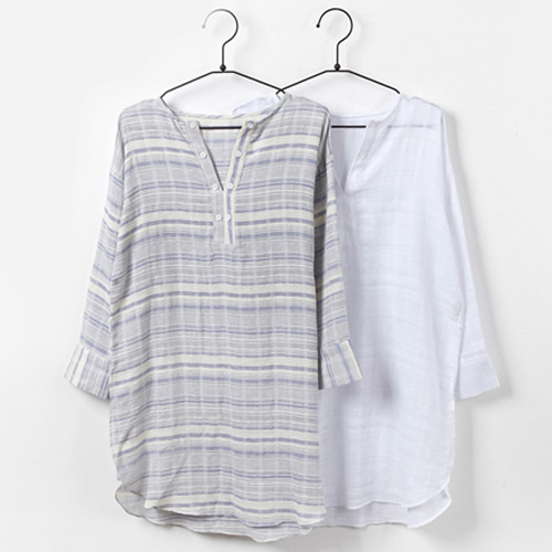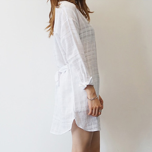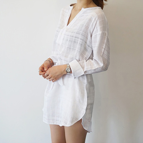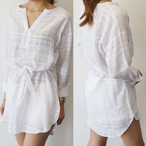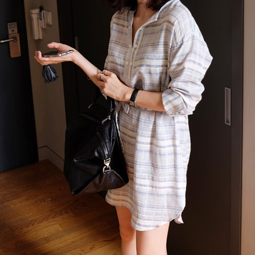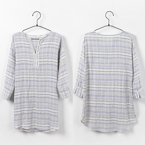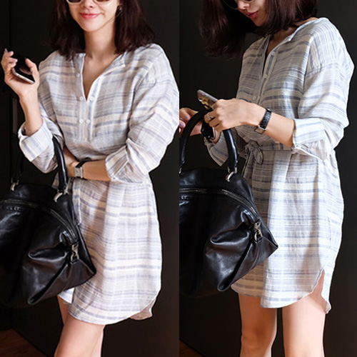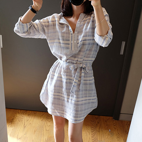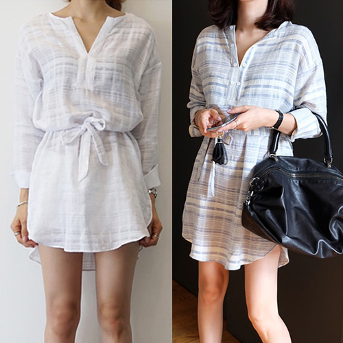 striped style with long sleeve,v-neck,high-low hem and gathered waist design. Keep