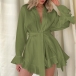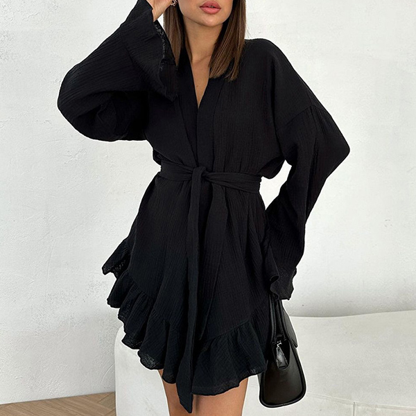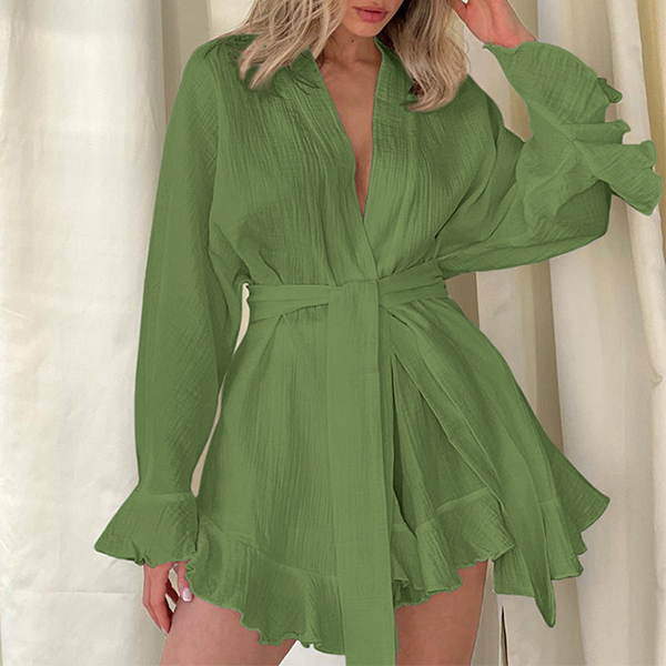 Fashion Solid Color V-neck Long Sleeveless Self-tie Ruffle Hemline Nightwear Dress