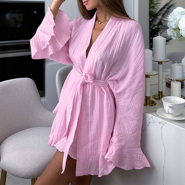 Experience ultimate comfort and style with this fashion nightwear dress! This dress features a flattering V-neckline, a sleeveless design for breathability, a self-tie waist for a customizable fit, and a charming ruffle hemline. Perfect for a relaxing night in or a comfortable sleep, this nightwear dress combines fashion and comfort seamlessly.