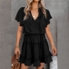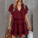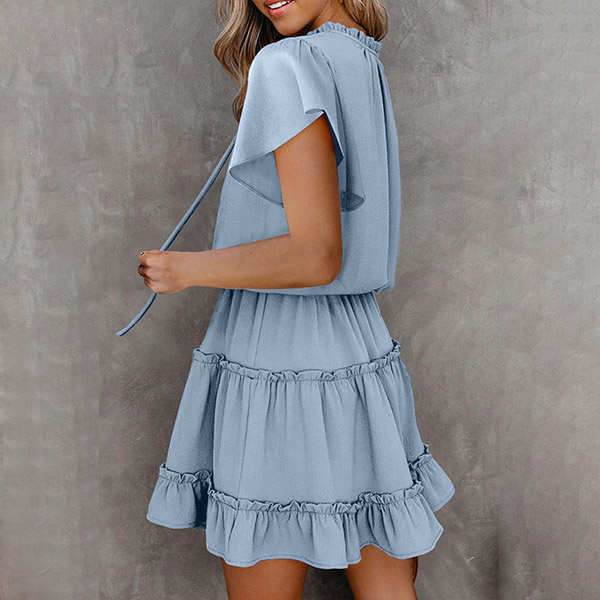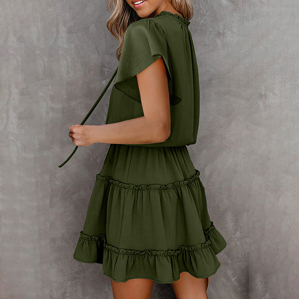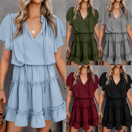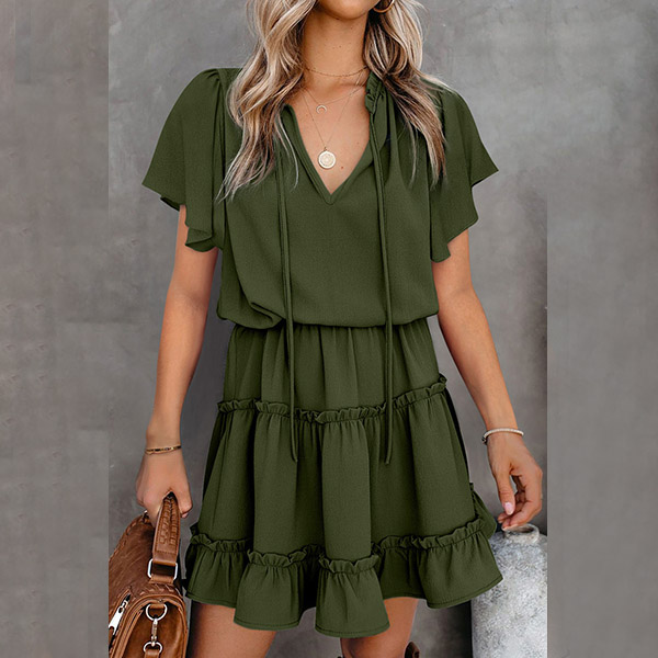 Fashion Solid Color V-neck Lotus Sleeve Ruffle Hem Dress